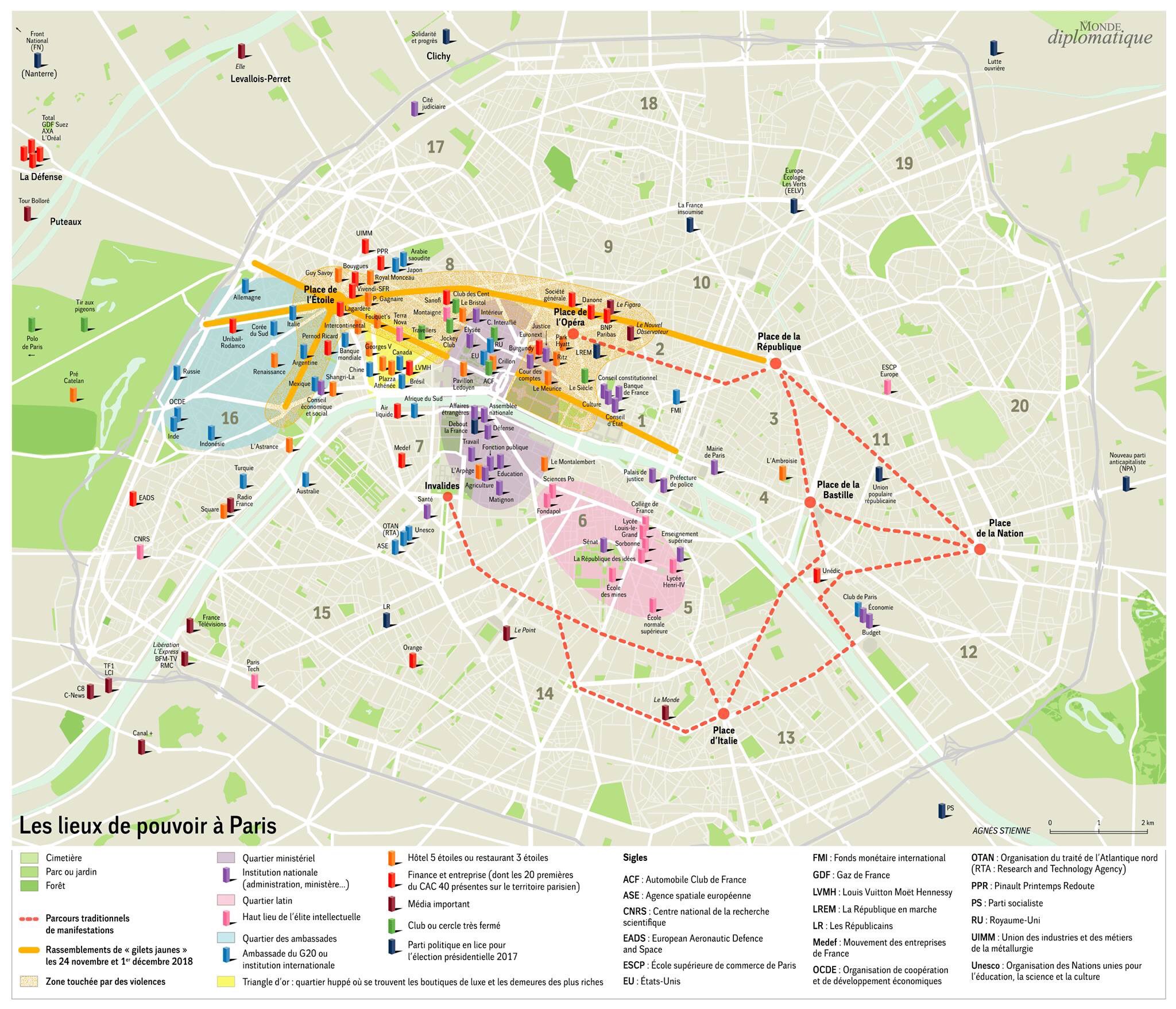 Vu sur Twitter : le Monde diplo a réalisé cette carte des lieux de pouvoir à Paris. Observez-la attentivement.