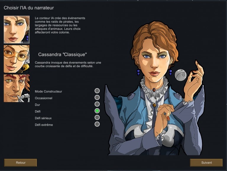Pour chaque narrateur, il y a ensuite plusieurs niveaux de difficulté, de “constructeur” à “défi extrême”. Il peut donc être plus simple de choisir Phoebe dans une difficulté assez légère que Cassandra : ça restera simple, mais vous aurez davantage d'événements. Les possibilités de panachage sont relativement immenses (et je ne vous parle même pas des mods rajoutant de nouveaux narrateurs…) Vous pouvez également choisir entre le fait de pouvoir sauvegarder à intervalles réguliers… ou pas.
