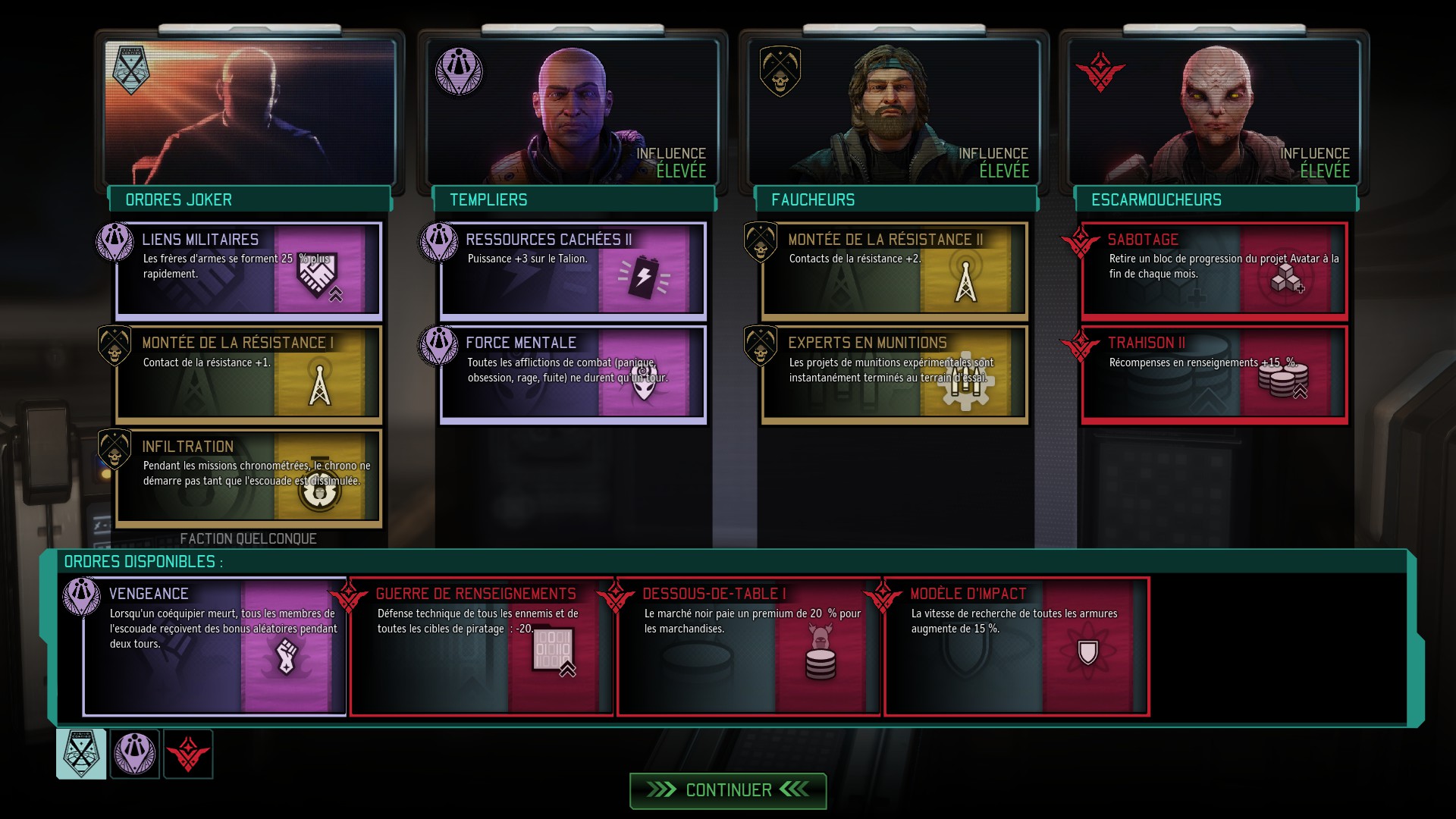 du port d'Alexandriedu marché noir : utilisez vos renseignements pour contactez le plus vite possible les régions tenues par la résistance sur la carte : c'est un investissement de long terme, mais vital. Il est tout à fait possible de planter une partie de 20h et + à cause de l'asséchement des ressources consécutif aux attaques et sabotages des élus sur la Résistance. De plus, contacter ces régions vous permettra d'accéder aux centres secrets et de ralentir l'avancée du projet Avatar… - Recherche : alternez l'attaque et la défense ! Si vous vous concentrez sur la recherche des meilleures armes en négligeant les armures, vos soldats pourront se faire dégommer d'un seul tir par certains ennemis avancés, voire par un coup critique d'un ennemi de plus bas niveau. Et perdre un soldat (quand ce n'est pas toute l'escouade…) déjà bien avancé dans sa progression (major ou lieutenant) juste parce qu'il n'avait pas l'armure qu'il aurait fallu, c'est vraiment rageant. Et ça peut enclencher le début de la spirale de la loose.