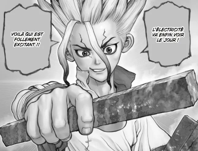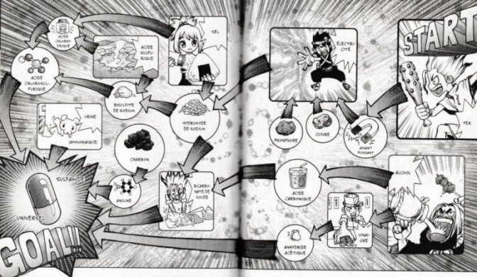 Dr. Stone, c’est un peu Rim World qui rencontre C’est pas sorcier [2] ; en partant de rien, Senku va petit à petit progresser dans l’arbre technologique, ce qui fournit le prétexte à expliquer de façon didactique les notions de physique ou de chimie mises en œuvre.